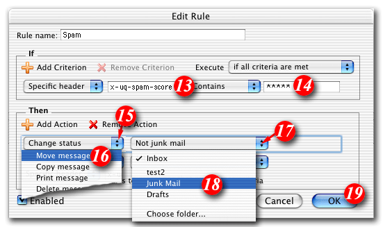 For example, if you wanted to consider anything with a score of 4 or more to be spam, the rule would look like: 'X-SpamDetect: ***'. Decreasing the number of asterisks will result in classifying more e-mails as spam. You may need to check your spam folder more carefully for non-spam e-mails that might have been classified as spam. If you wanted to rate anything with a score of 8 or greater as spam, the rule would look like: 'X-SpamDetect: ********'. Increasing the number of asterisks may result in fewer filtered e-mails being classified as spam and more potential spam staying in your Inbox.